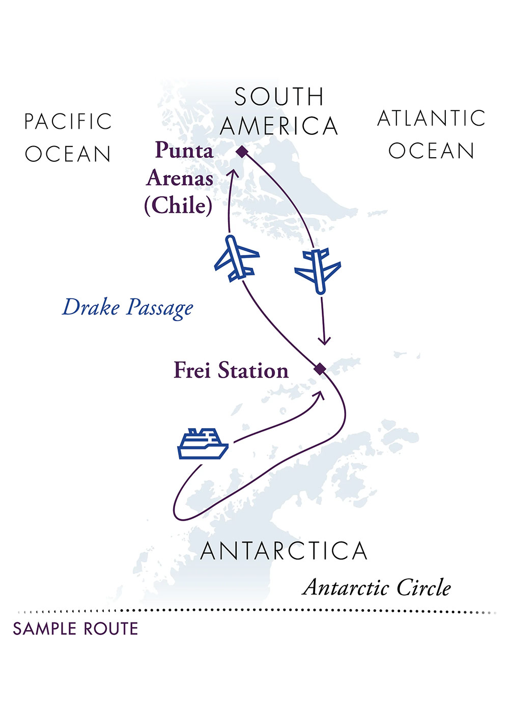 南極クルーズ最大の難所とされるドレーク海峡を飛行機で越えることで、移動の負担を最小限に抑えます。