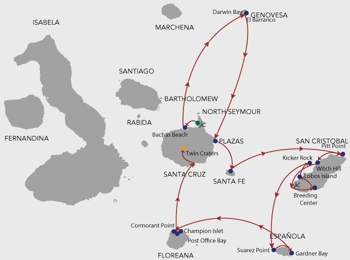 クルーズ船乗船後、船内およびガラパゴス諸島内での生活や決まりについての説明をうけます。 午後:サンクリストバル島 へ船に戻りウェルカミングカクテルを飲みながら船長、クルー、ガイドの紹介と翌日の説明をうけます。 | に到着午前:エスパニョーラ島 午後:エスパニョーラ島 へ | へ午前:フロレアナ島 午後:フロレアナ島 へ | へ午前:サンタ・クルス島 | へ から帰路へ