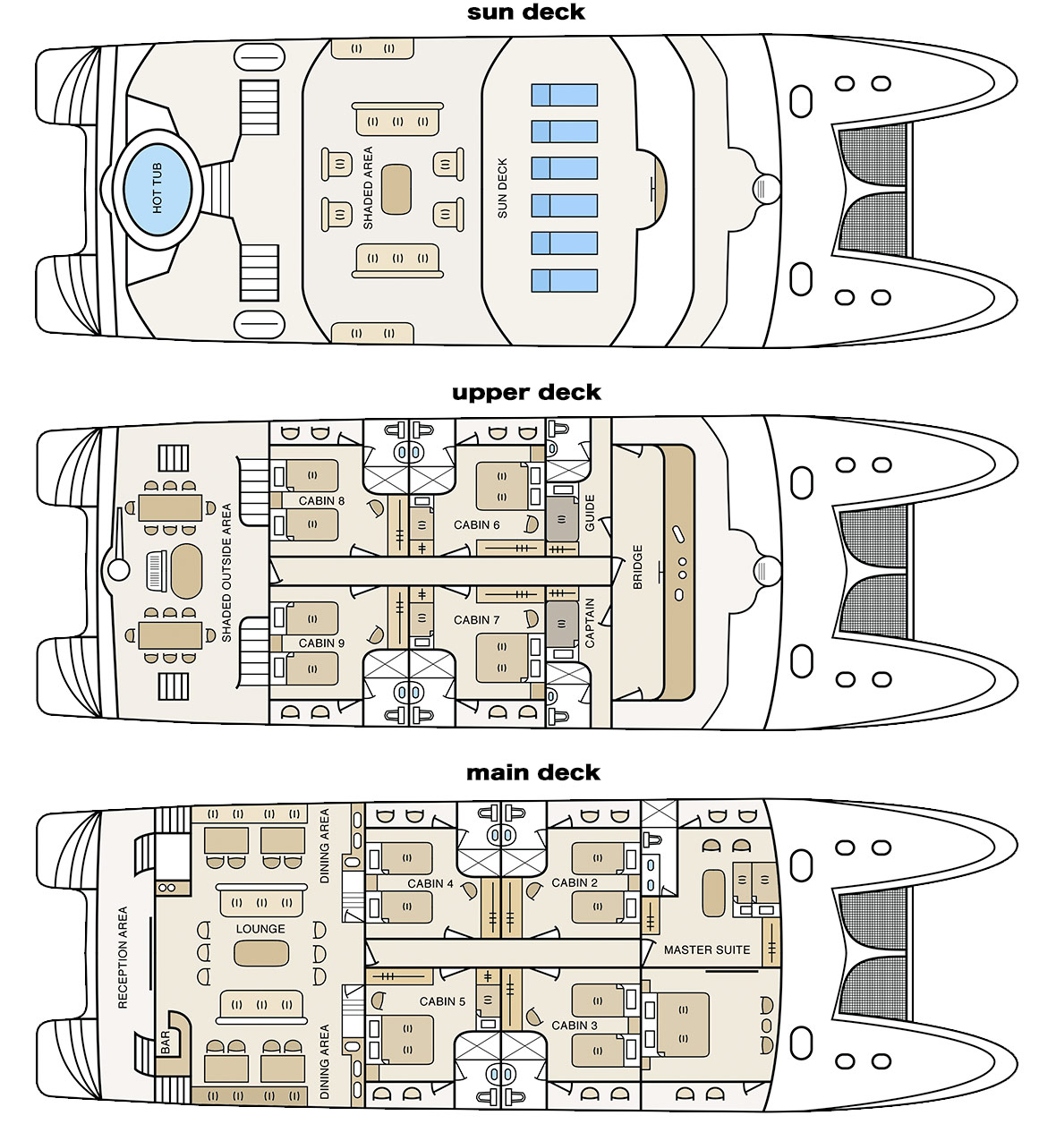 2009年に建造されたトレジャー・オブ・ガラパゴスはガラパゴスのファーストクラス・カタマランでも特に人気の高い船です。全キャビンにバルコニーを備え居住性はもちろん、クルーの対応やサービスにも定評があり、弊社が自信を持っておすすめする船です。